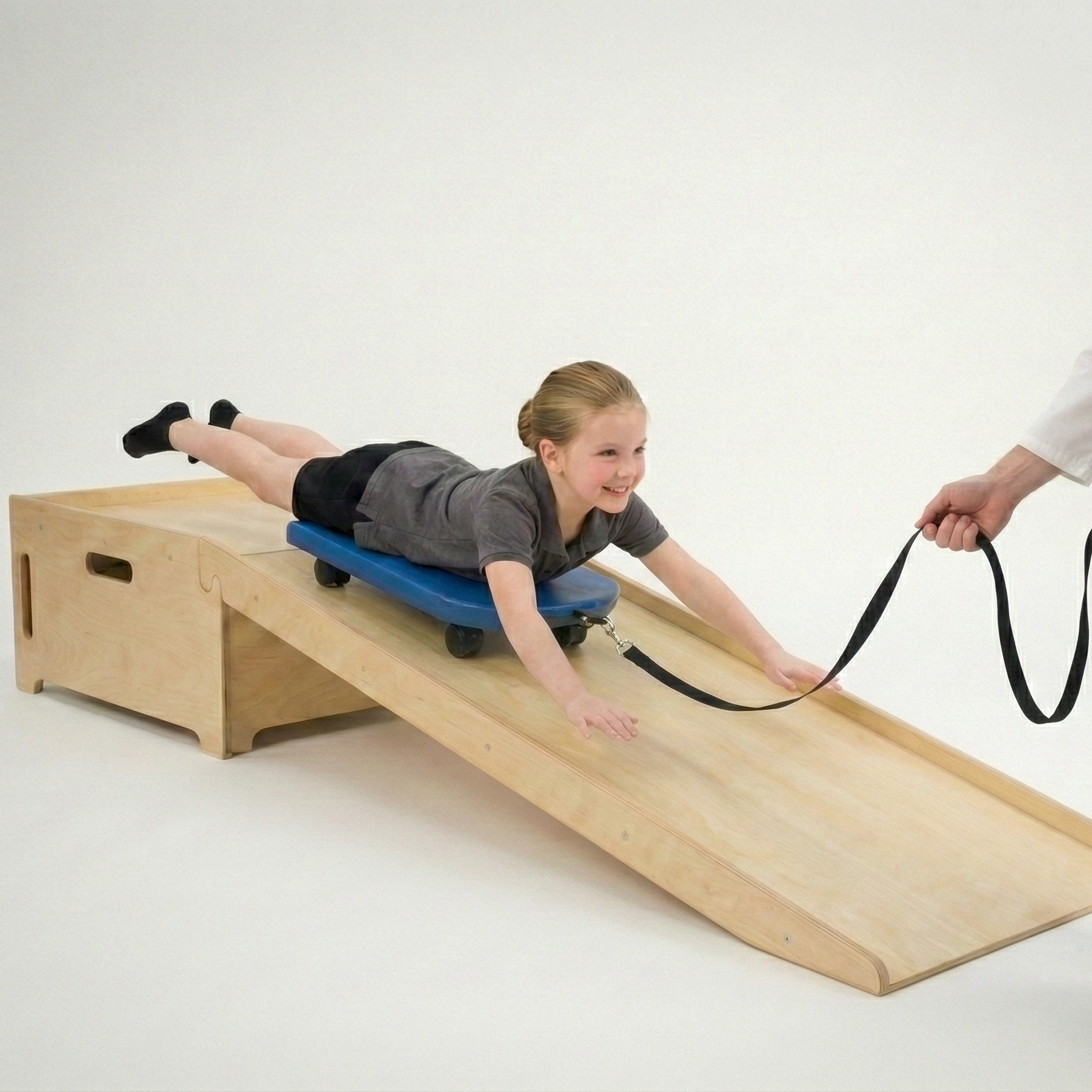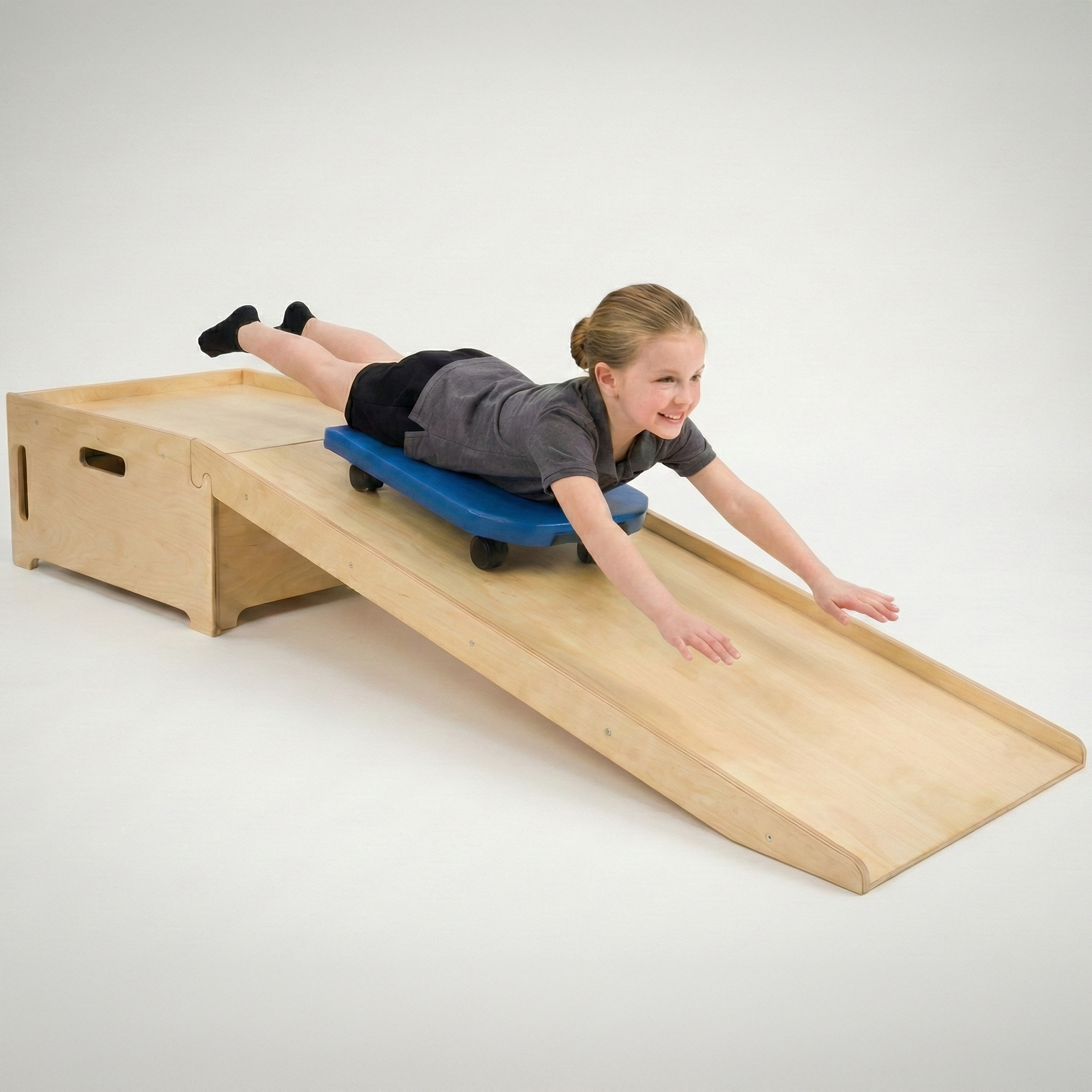 A secure, space-smart scooter board ramp set for therapy-led movement programmes in schools, clinics and sensory rooms.